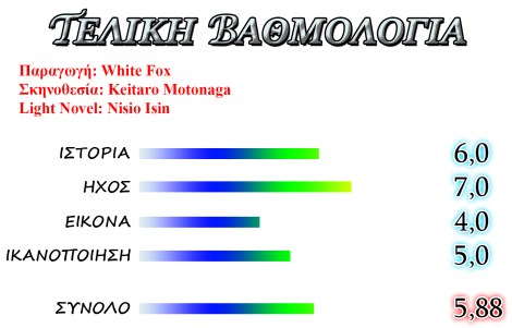 Όσοι είστε φαν του Monogatari Series, αυτή η σειρά δεν θα σας απογοητεύσει. Αμφιβάλλω όμως ότι θα σας ενθουσιάσει, ακόμα δυσκολότερα και όσοι θα ασχοληθούν με αυτόν τον συγγραφέα για πρώτη φορά.