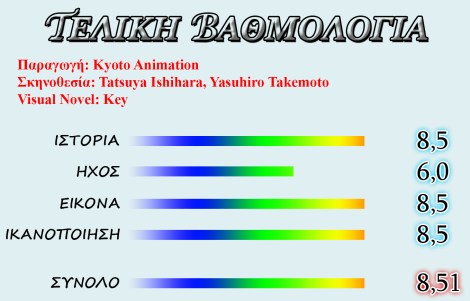 Η μαεστρία του Jun Maeda είναι εμφανής πίσω από αυτήν την σειρά. Το χιούμορ είναι απερίγραπτο, αλλά αυτό που με κέρδισε ιδιαίτερα ήταν το After Story με τα συναισθήματα που μου προκάλεσε. Η αίσθηση ότι τα πάντα γύρω μας, αλλά και πάνω μας, αλλάζουν χωρίς εμείς να μπορούμε να κάνουμε κάτι, μόνο να ωριμάσουμε και να προσπαθήσουμε να τα αντιμετωπίσουμε ήταν έντονη και διατυπώθηκε με πολύ επιτυχία. Οι χαρακτήρες μεγαλώνουν πραγματικά κατά τη διάρκεια της σειράς, αποφοιτώντας από το σχολείο και μπαίνοντας στη ζωή, προσπαθώντας να αντιμετωπίσουν αληθινά προβλήματα ζωής, όπως το να βρουν μια δουλειά προκειμένου να επιβιώσουν.