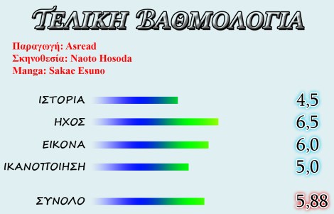 Ο μόνος λόγος που η βαθμολογία μου δεν είναι χειρότερη είναι επειδή η βασική ιδέα ήταν αρκετά πρωτότυπη. Επίσης, μετά το επεισόδιο 19 γίνεται μεγάλη αλλαγή στο στυλ της ιστορίας, αλλά και στο στυλ του πρωταγωνιστή όπου παύει να είναι τόσο πολύ κλαψιάρης και η ιστορία θυμίζει πολύ περισσότερο πόλεμο, αυτό που περίμενα να δω δηλαδή, και άρχισε να με ικανοποιεί ιδιαίτερα. Παρόλα αυτά, τα ενοχλητικά στοιχεία υπήρχαν ακόμα και μετά από το επεισόδιο 19, αλλά τουλάχιστον η ιστορία κλείνει αρκετά ευχάριστα και απαντάει σε όλα τα ερωτήματα που μπορεί να έχει ο θεατής κατά τη διάρκεια του anime (και, πιστέψτε με, είναι πολλά).