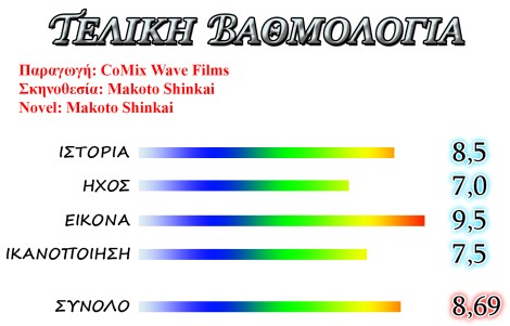 Είναι άλλη μια εξαιρετική ταινία του Makoto Shinkai χωρίς καμία αμφιβολία. Ίσως ξεκίνησα να την βλέπω με πολύ μεγαλύτερες προσδοκίες μετά από όλα όσα είχα ακούσει και να περίμενα πολύ περισσότερα, παρόλα αυτά η ταινία ήταν φανταστική.