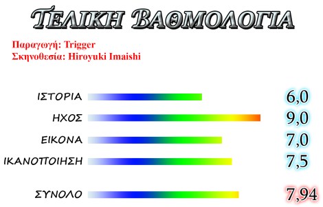 Επίσης, σκηνοθετικά η σειρά έχει πάρα πολύ ενδιαφέρον και είναι επίσης ένα από τα χαρακτηριστικά της. Τα πλάνα, το στυλ όλης της σειράς και, κυρίως, τα γράμματα που γεμίζουν συνέχεια την οθόνη, με έκαναν να αναρωτιέμαι εάν τελικά ο σκηνοθέτης είναι ο Quentin Tarantino! Αξίζει να προσέξει κανείς τα κοινά μεταξύ του Hiroyuki Imaishi και του Tarantino, αν και είναι τόσο εμφανή που δεν χρειάζεται και ιδιαίτερη προσοχή.