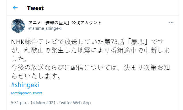 Το 14ο επεισόδιο του Attack on Titan Final Season διακόπηκε, λόγω σεισμού στον νομό Wakayama. H τηλεοπτική προβολή σταμάτησε και την θέση της πήραν τα έκτακτα δελτία, ώστε να ενημερωθούν οι κάτοικοι σχετικά με την σεισμική δόνηση.