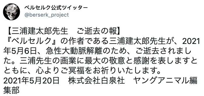 https://www.animenewsnetwork.com/news/2021-05-19/berserk-manga-creator-kentarou-miura-passes-away-at-54/.172988