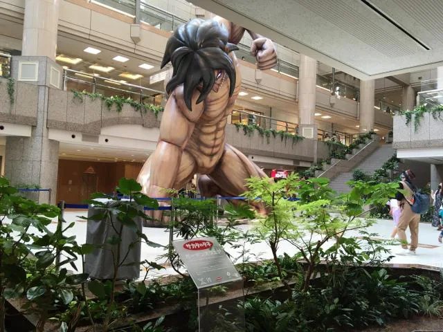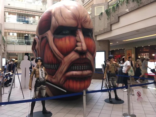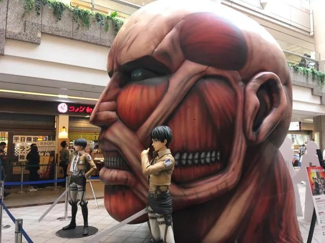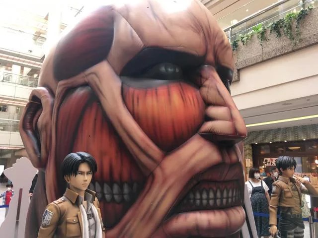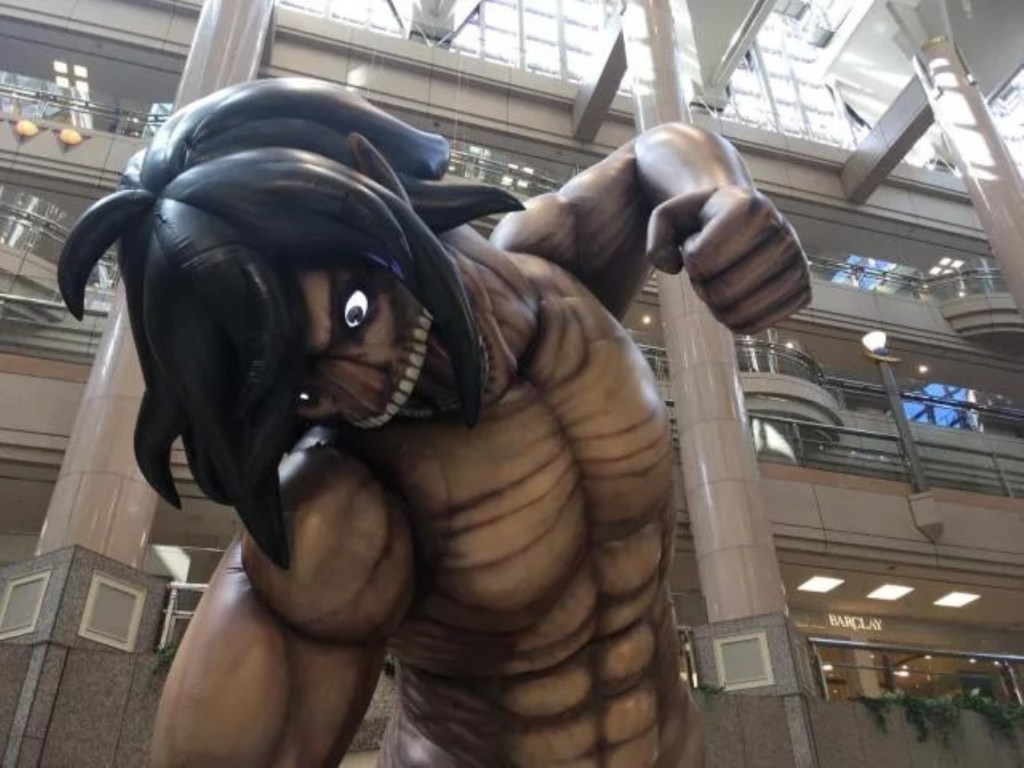 Στην εμπορική περιοχή Minato Mirai της πόλης Yokohama και πιο συγκεκριμένα στο συγκρότημα Landmark Plaza του ομώνυμου «πύργου»/ουρανοξύστη, εκεί βρίσκονται τα φουσκωτά «αγάλματα» των τιτάνων του Attack on Titan σε πραγματικό μέγεθος. Το κεφάλι του Colossal Titan (κολοσσιαίος τιτάνας) με τον Levi να το «δειγματίζει» και ο Eren στην μορφή του ως τιτάνας να στέκεται επιβλητικός στα 8,5 μέτρα. Έτοιμος για επίθεση ο Eren έχει ακουμπήσει τα γόνατα του στο έδαφος (για αυτό και είναι 8,5 και όχι 15 μέτρα που είναι το ύψος του σαν τιτάνας) και έχει σφίξει τη γροθιά του!